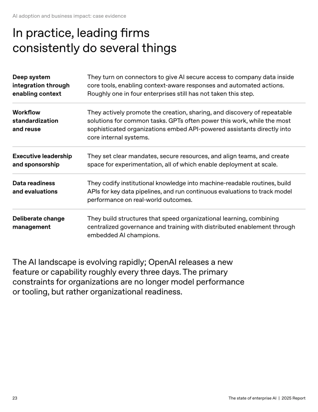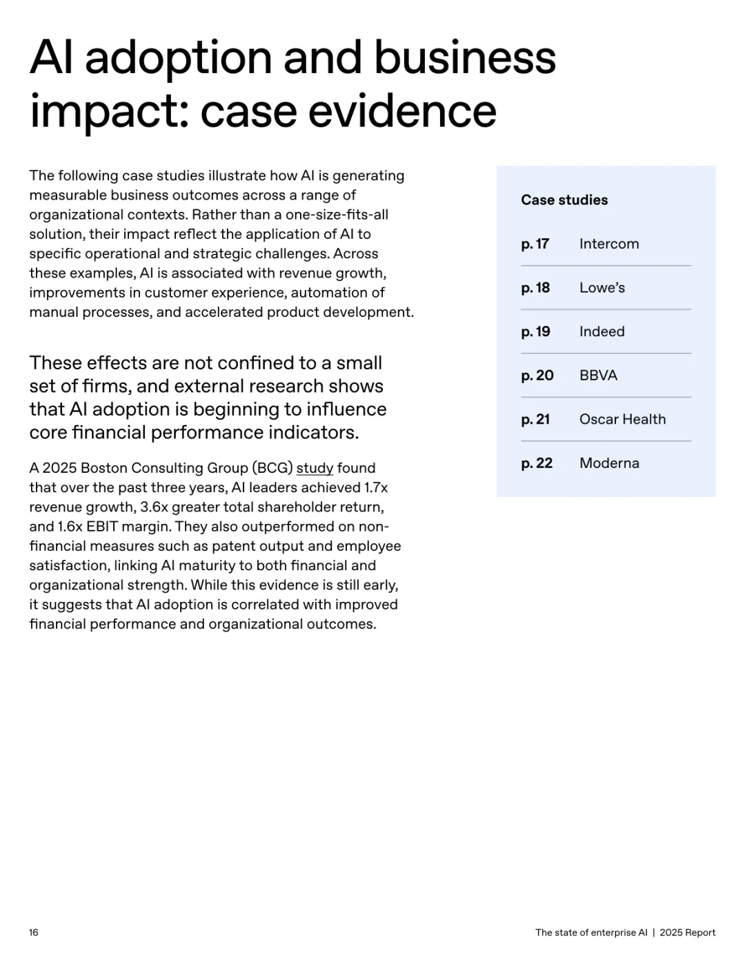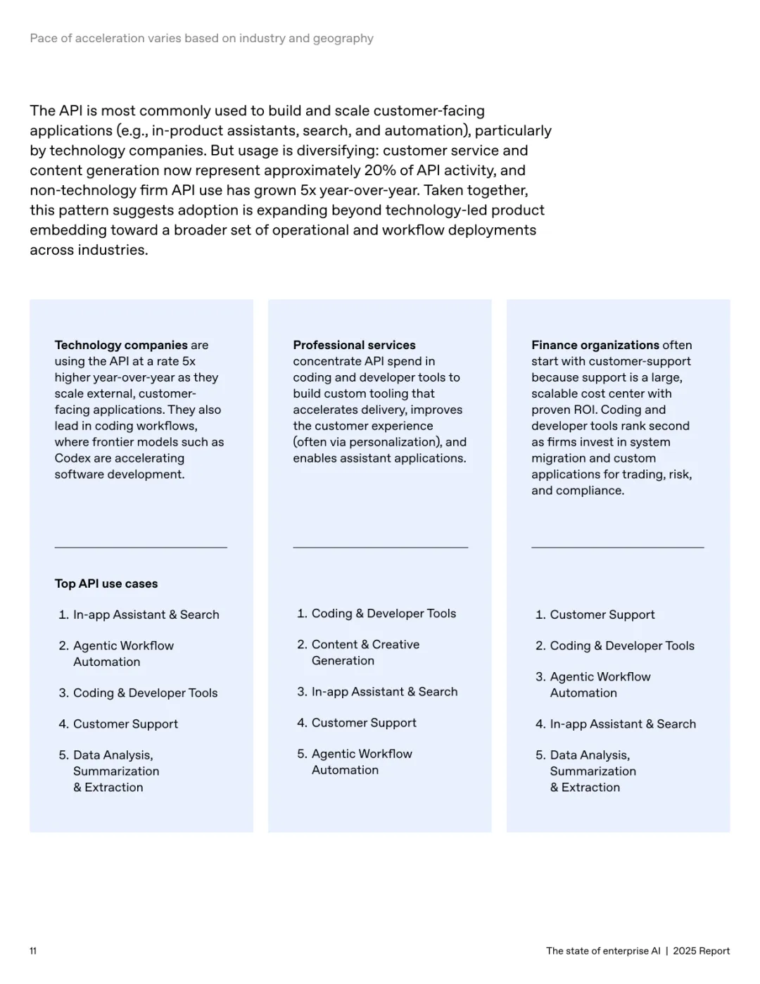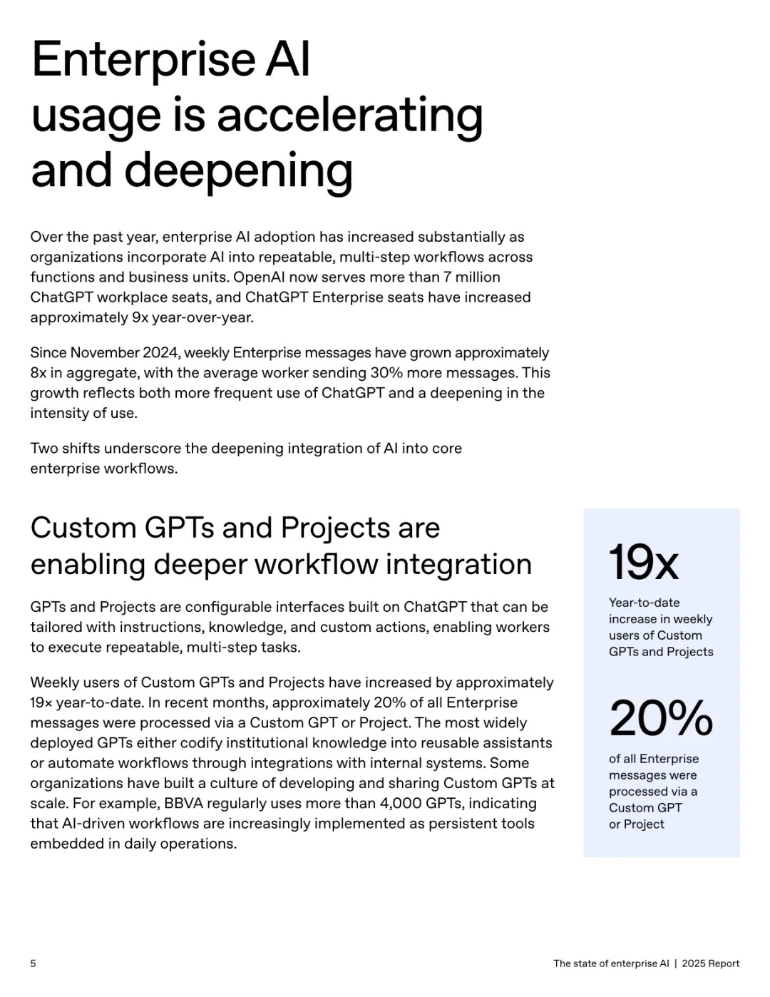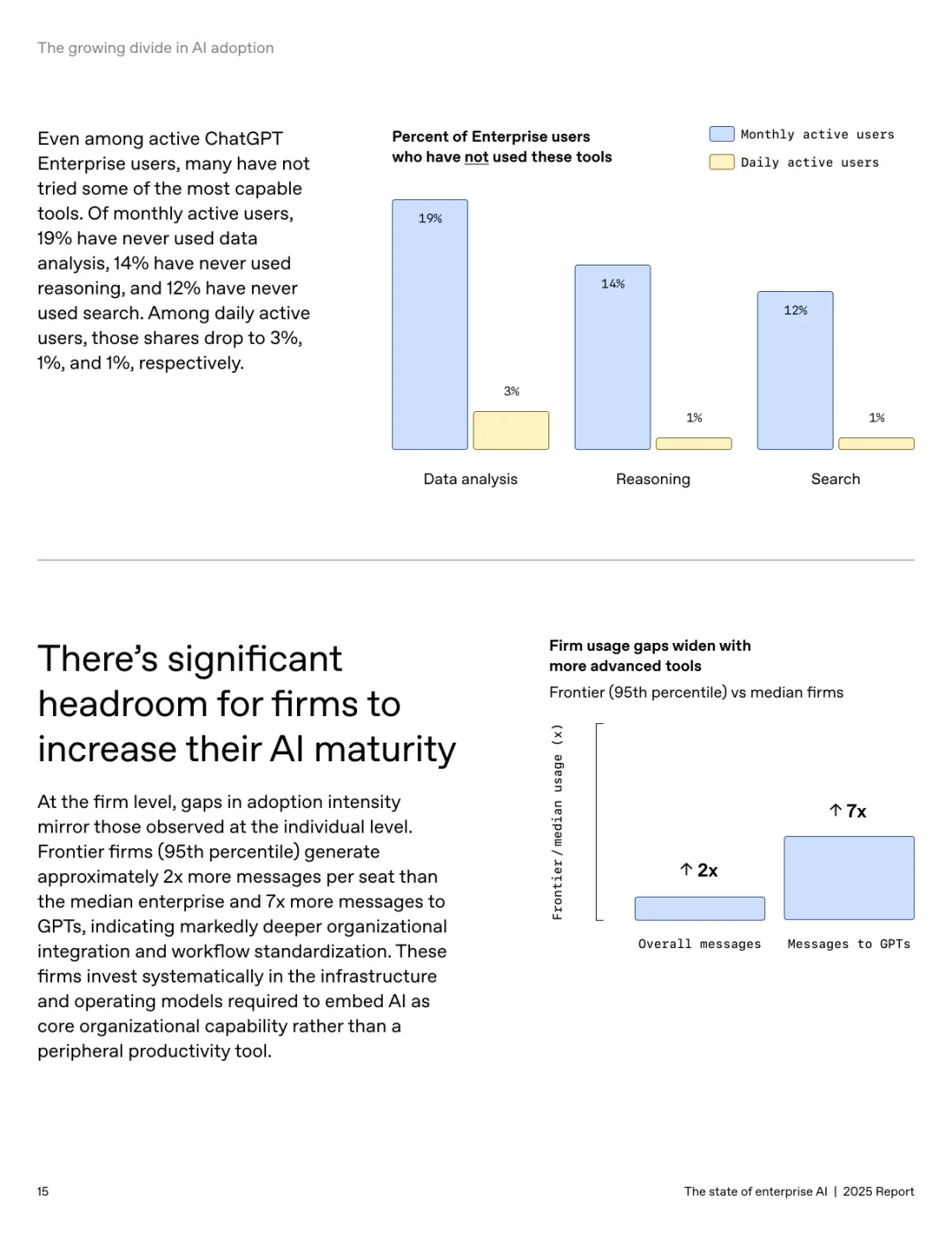 导读:报告基于超 100 万企业客户的使用数据及 9000 名员工调研,系统呈现企业人工智能应用的现状、价值与趋势。企业 AI 应用正加速规模化并深度融入工作流,ChatGPT 企业版座位数同比增长 9 倍,API 推理令牌消耗增长 320 倍。定制化 GPT 和项目功能的周活跃用户同比增长 19 倍,20% 的企业消息通过这类工具处理,展现出强劲的落地动能。全球各行业 adoption 全面提速,科技行业年增长 11 倍领跑,医疗、制造业紧随其后,国际市场中澳大利亚、巴西等国增速超 143%。AI 为企业带来显著价值,员工日均节省 40-60 分钟,75% 的受访者能完成此前无法胜任的任务,涵盖数据分析、编码等技术工作。案例显示,AI 助力企业实现营收增长、客户体验优化及产品开发周期缩短。但企业间应用差距正扩大,前沿企业人均消息量是普通企业的 2 倍,未来需通过系统集成、工作流标准化与变革管理,充分释放 AI 的商业潜力。