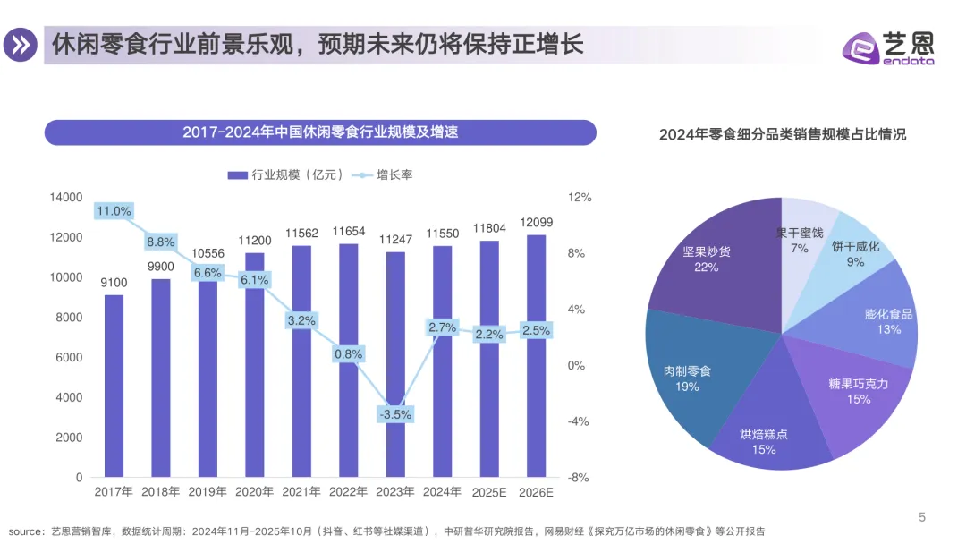 中国零食行业发展态势,剖析市场热度、消费需求与营销趋势,为行业发展提供参考。2024 年零食行业持续正增长,细分品类中坚果炒货、肉制零食、烘焙糕点占比领先。