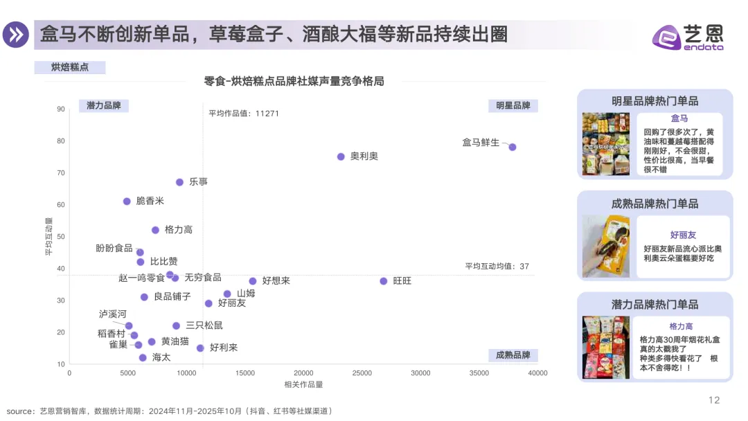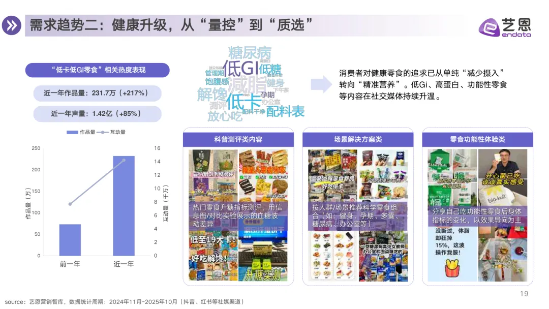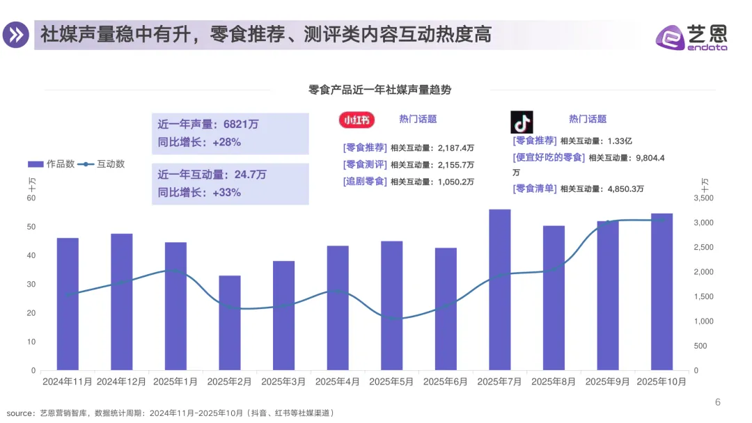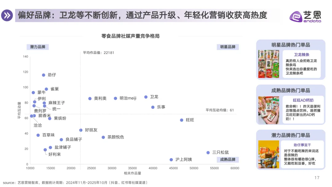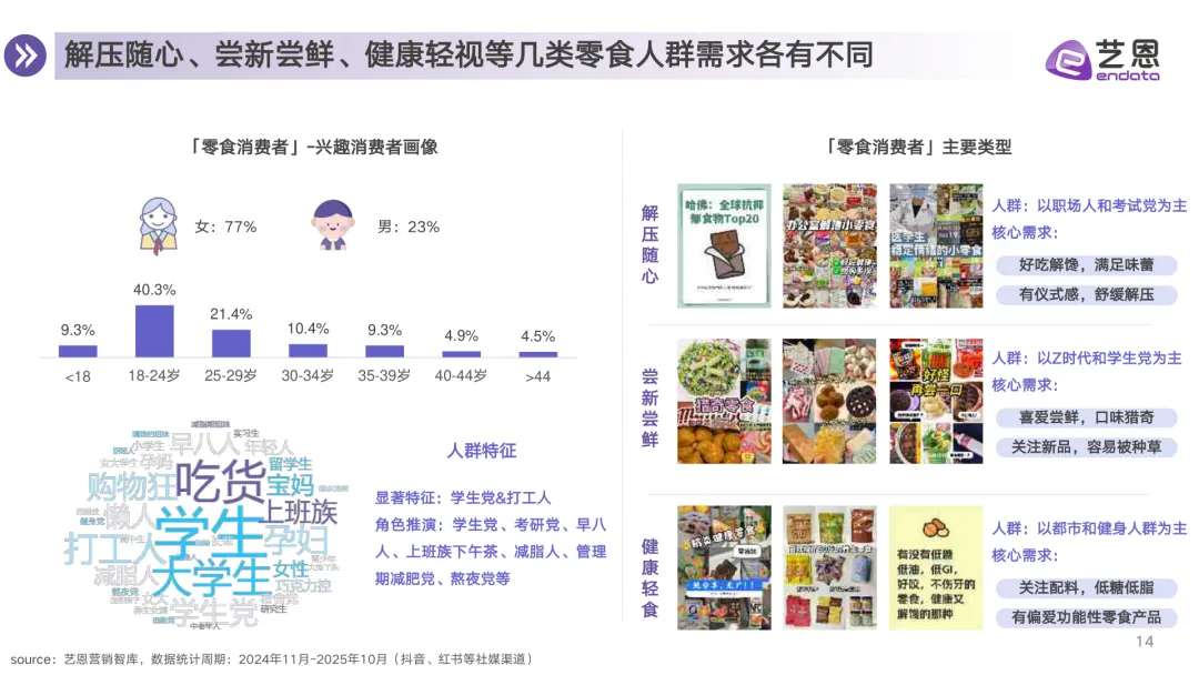 社媒声量稳步上升,小红书成为核心种草阵地,零食推荐、测评类内容互动量突出。消费者以年轻群体为主,需求呈现多元特征,既关注口感口味与配料健康,追求低糖低脂、功能性营养,又重视情绪价值与社交属性。