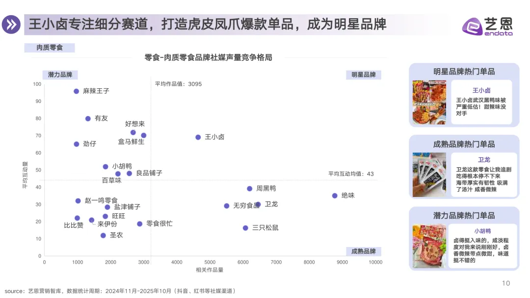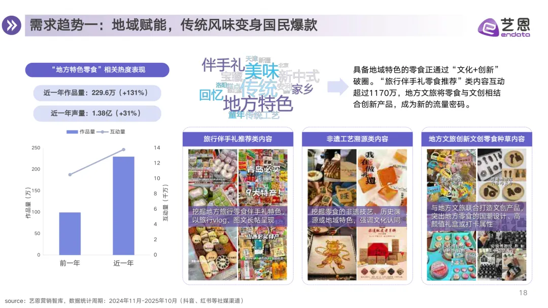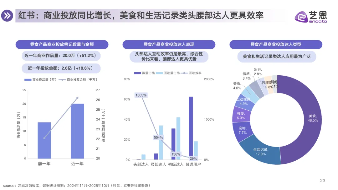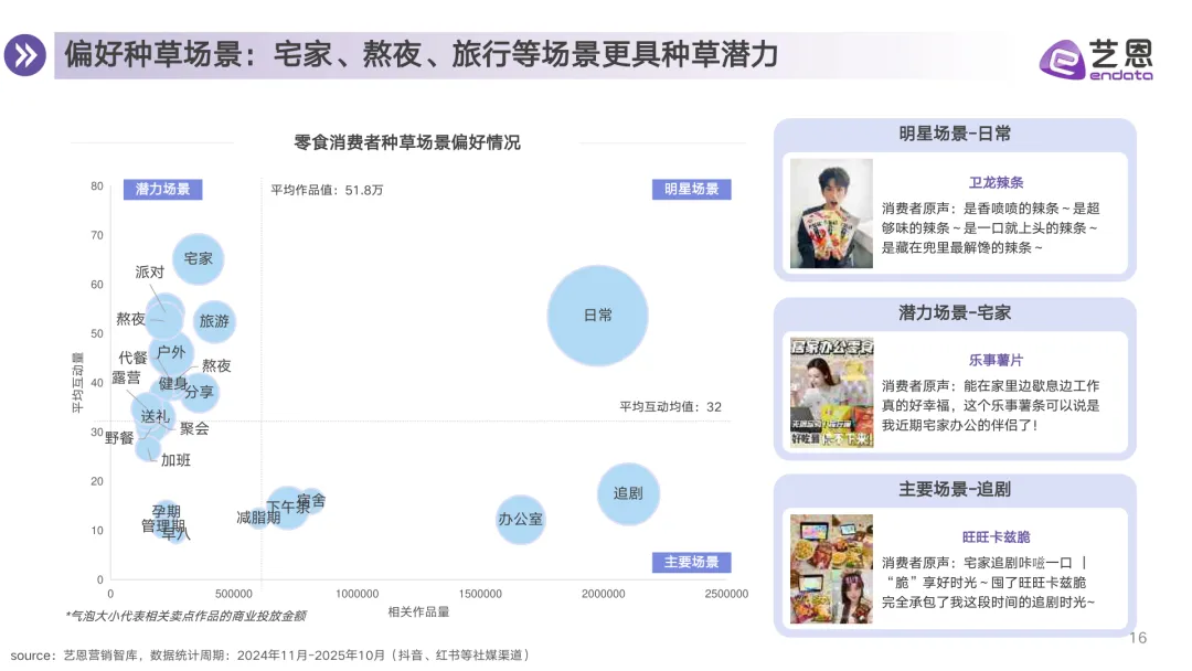 消费场景从日常休闲延伸至熬夜、露营、下午茶等多元场景,地域特色零食、治愈系零食、创意吃法类产品热度飙升。营销端,品牌倾向于小红书商业投放,美食与生活记录类达人效果显著,健康、联名、仪式感成为核心卖点。抖音平台则以价格导向内容为主,低价秒杀、超值购等话题互动活跃,推动行业向精细化、场景化升级。