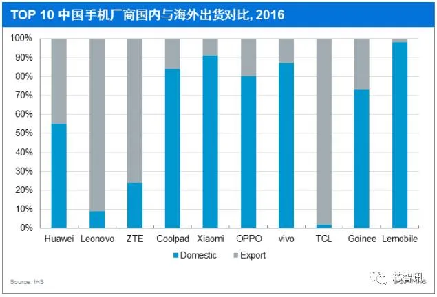 根据中国OEM智能机出货数据,2016年中国OEM品牌在海外市场出货增长11.6%,其中华为、OPPO、vivo、联想和小米等2016年在海外市场均实现增长。目前联想、TCL和中兴的海外市场智能机出货超过中国市场,且出货主要以中低端机型为主。华为海外市场出货占比45%,2016年中高端机型在海外市场均实现了增长,OPPO和vivo海外市场智能机出货量翻番。