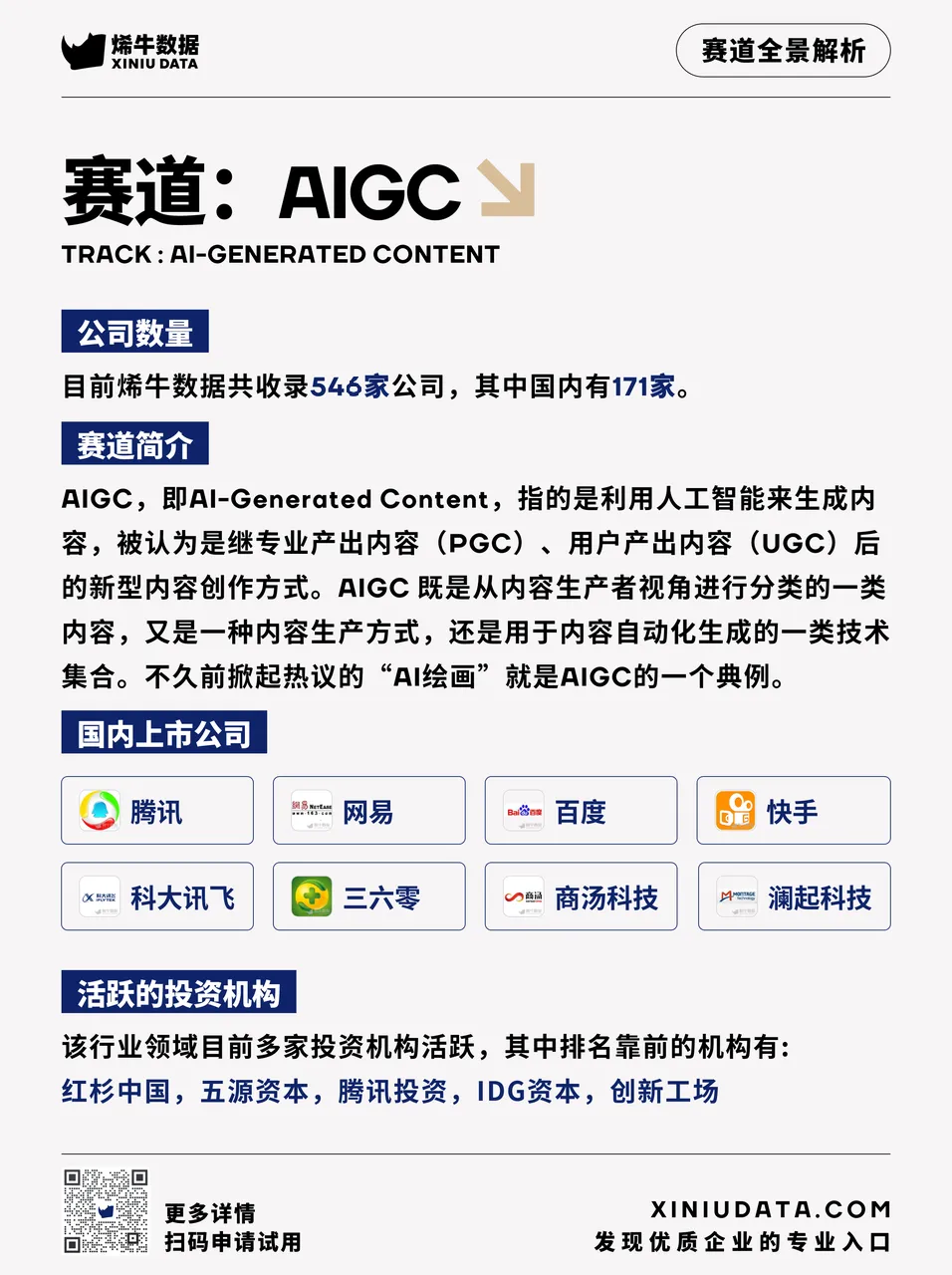 深言科技是一家文本信息处理平台,致力于用前沿的人工智能和自然语言处理技术,尤其是大规模预训练模型技术,为个人和组织系统化重塑文本信息处理全流程。通过文本摘要、语义检索、信息抽取等技术在信息爆炸时代提高信息获取的效率,同时通过可控文本生成、素材自动推荐、文本校对和风格检查实现文本内容创作的提质增效。标贝科技是一家人工智能语音交互服务商,基于AI、SaaS开放平台,为客户提供AI数据服务、技术能力、智能语音交互方案赋能服务,包括通用场景的语音合成和语音识别,以及TTS音色定制,声音复刻,情感合成和声音转换在内的语音技术产品,AI数据业务涵盖语音合成、语音识别、图像视觉、NLP等采标服务和平台化自研工具能力。在国内AIGC行业中,目前多家投资机构活跃参与其中,其中排名靠前的机构有红杉中国、IDG资本、腾讯投资、五源资本、创新工场等。投资机构对AIGC技术和应用的发展潜力和商业价值看好,认为AIGC可以激发创意,提升内容多样性,降低制作成本,实现大规模应用,同时这些机构也在不断加大对AIGC技术和应用的投资力度和支持力度,以促进行业的健康和快速发展。