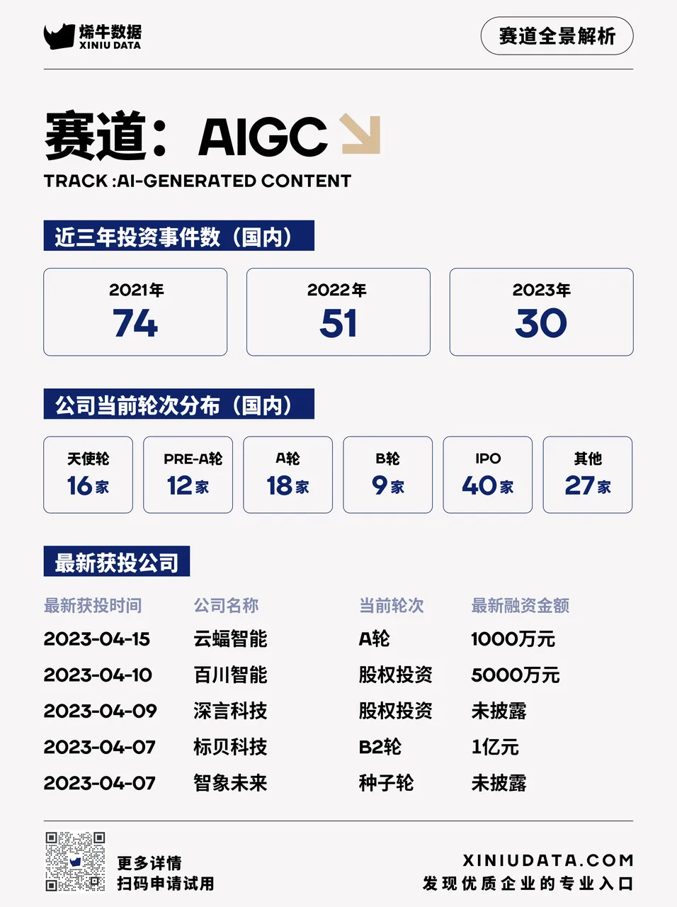 AIGC技术的出现,打破了传统内容生产的局限性和瓶颈,使得内容的创作和传播更加高效、多样和智能。AIGC技术可以根据用户的需求和喜好,自动生成各种形式和风格的内容,如文字、图片、音频、视频等,满足用户在不同场景下的信息获取和娱乐消费。AIGC技术也可以根据数据和算法,自动优化和调整内容的质量和效果,如语言表达、图像清晰度、音频质量等,提升用户的体验和满意度。根据烯牛数据显示,目前已经收录了全球546家、国内171家从事AIGC相关业务的公司,其中43家上市公司,如腾讯、网易、百度、快手、科大讯飞、三六零、商汤科技、澜起科技等,目前各个轮次的分布情况如下:天使轮16家,pre-A轮12家,A轮18家,B轮9家,IPO40家,其他的27家。近三年来,国内AIGC行业的投资事件数保持一个较为稳定的趋势,2021年有74起融资事件,2022年有51起,2023年截止到目前已有31起融资事件,国内有着AIGC相关业务的公司都在不同阶段和方向上推进AIGC技术和应用的发展和落地,展现了强大的创新能力和市场潜力。近期有多家公司获得了不同阶段的融资支持。云蝠智能在2023年4月15日完成了A轮1000万元的融资;百川智能于2023年4月10日完成了股权投资5000万美元的融资;深言科技在 2023年4月9日完成了股权投资。标贝科技和智象未来分别在2023年4月7日完成了B2轮1亿元和种子轮的融资。在最新获投的公司中,百川智能是一家研发并提供通用人工智能服务的公司,旨在打造中国版的OpenAI基础大模型及颠覆性上层应用。百川智能借助语言AI的突破构建大模型底座,并在搜索、多模态、教育、医疗等方面增强,帮助大众轻松、普惠的获取世界知识和专业服务。