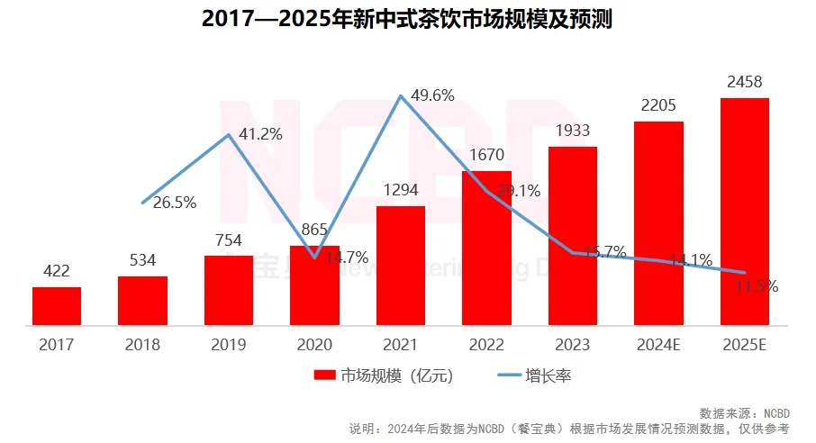 2、2023年,新中式茶饮市场规模达1933亿元,同比增加15.7%;预计到2025年,新中式茶饮市场规模将逼近2500亿元。