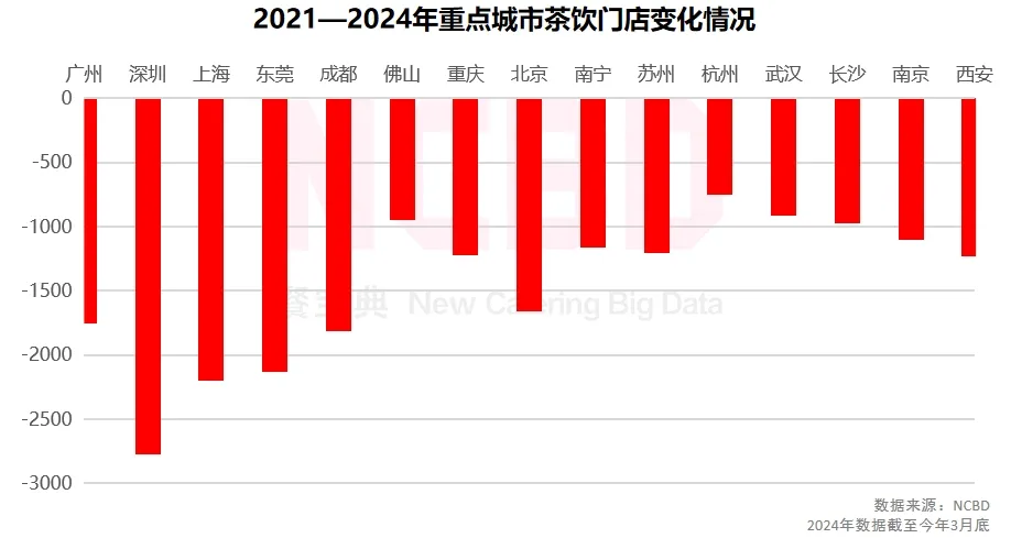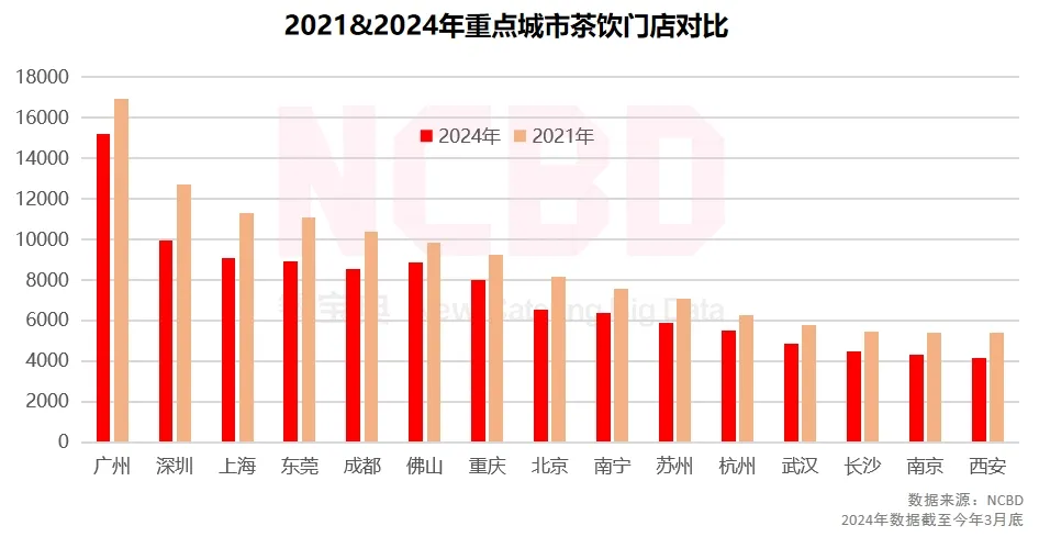 6、截至今年3月底,广州仍然是茶饮门店最多的城市;2021年,有五个城市(广州、深圳、上海、东莞、成都)的茶饮门店数在10000家以上,到了2024年仅剩广州;此外,佛山的门店数反超成都,位居第五。