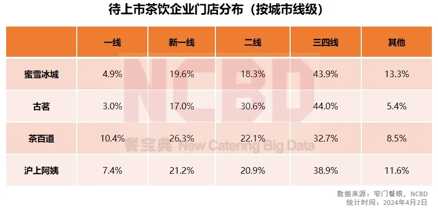 从门店分布来看,待上市茶饮企业的门店主要分布于三四线城市,其中蜜雪冰城、古茗三四线城市的门店占比高达44%;茶百道在一二线城市的门店占比要明显高于其他几个品牌。