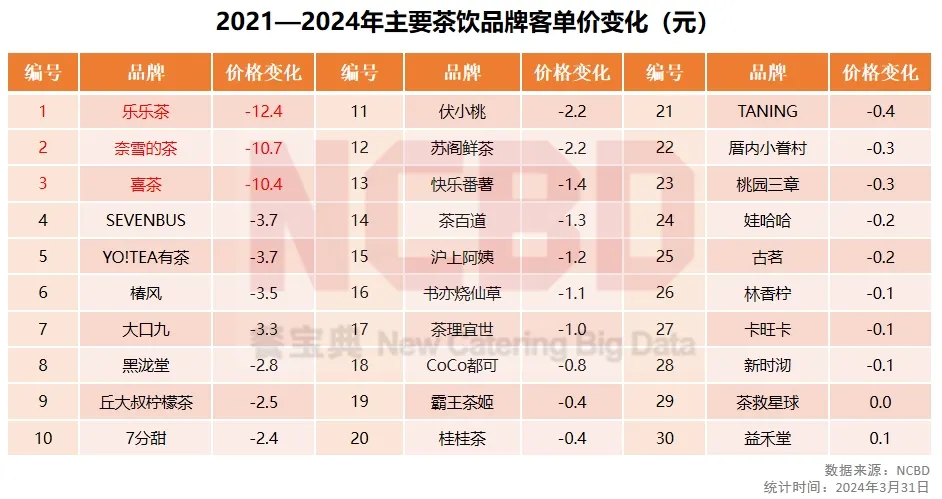 13、从2021年至2024年茶饮品牌的价格变化来看,乐乐茶、奈雪的茶、喜茶三大品牌降幅最大,整体降幅均超过10元,已经从第一梯队进入第二梯队;总体来看,在餐宝典监测的50多个茶饮品牌中,56%的品牌有不同程度的降价。
