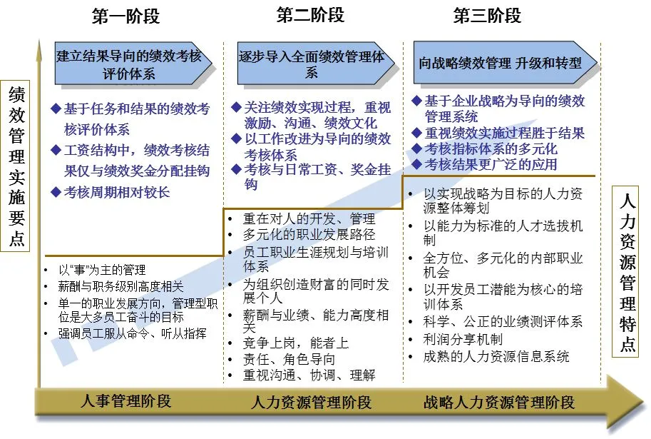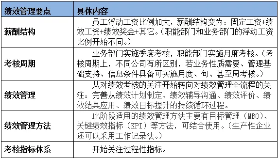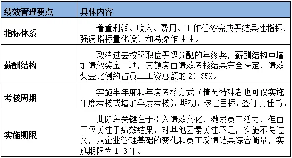 第二阶段重点在于从对绩效结果的关注转向对绩效过程的关注,重在健全绩效管理全流程,完善公司培训等支持体系。