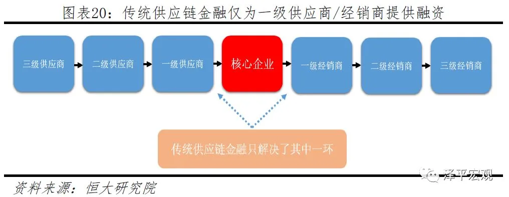 首先,当前模式下,银行主要依赖供应链核心企业的控货和销售能力,而由于其他环节的信息不够透明,银行出于风控考虑往往仅愿意对上游供应商(一级供应商)提供应收账款保理业务,或对其下游经销商(一级经销商)提供预付款或存货融资。