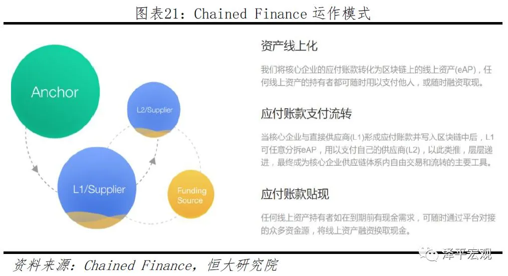2017年3月,互联网金融平台点融网和富士康集团旗下金融平台富金通合作推出区块链金融平台“Chained Finance”。Chained Finance首先将核心企业的应付账款转化为区块链上的线上资产eAP,eAP可以在各级供应商之间流通(用于支付或用于融资取现)。