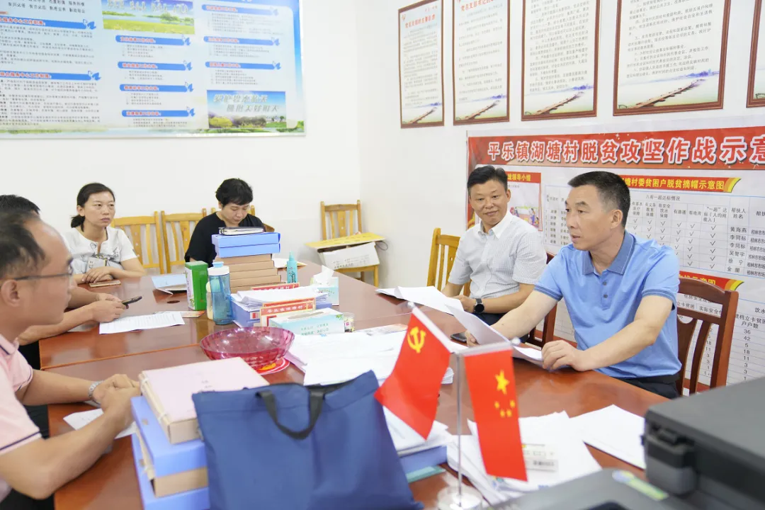 在平乐镇湖塘村座谈会上,驻村第一书记罗庆详细介绍了本村近期扶贫工作的成效和存在困难,黄健书记就存在的困难和问题与与会人员共同研究帮扶对策,要求村委会要克服松懈思想,严格按照村不漏户、户不漏人的要求,全面开展“回头看、再排查”,切实做到“户户清”。重点排查目前尚未脱贫的5户,有针对性地开展重点帮扶,让每一户都不掉队,全面夺取脱贫攻坚战的最终胜利。黄书记还了解了村委党建情况和村集体经济发展情况,指出新建的农产品交易市场各项手续应合法合规。