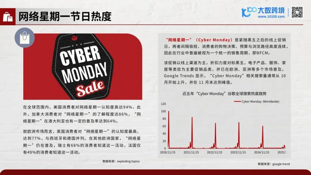 黑五网一的热度有目共睹。全球95%的消费者都知道“黑色星期五”,谷歌搜索量从10月开始飙升,到11月底达顶峰。网络星期一的认知度在美国高达94%,欧洲如英国也达77%,亚洲市场正快速跟进。