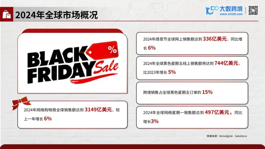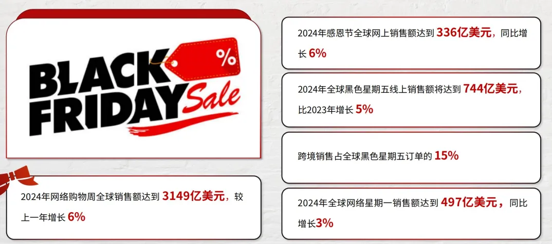 2024年数据显示,感恩节全球网上销售额达336亿美元,同比增长6%;黑五线上销售额744亿美元,涨5%;整个网络购物周总销售额3149亿美元,增6%。美国市场尤为亮眼,黑五当天在线消费108亿美元,同比增长10.2%,网络星期一达133亿美元。