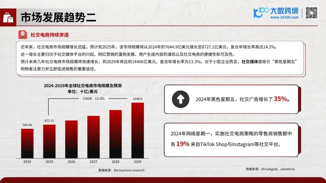 :市场规模从2024年的7645亿美元增至2025年8727亿美元,复合增长14.2%。黑五社交广告涨35%,19%的网一销售额来自TikTok Shop和Instagram。