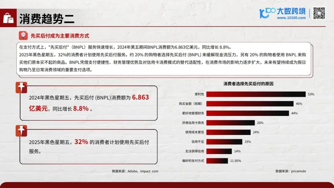 :2024黑五消费6.863亿美元,涨8.8%;2025年32%用先买后付,20%缓解现金流、20%买贵物。
