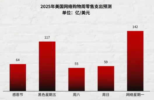 展望2025年,美国假日季(11月1日-12月31日)在线消费预计超2534亿美元,移动交易占比56.1%。黑五预计117亿美元,网一142亿美元,感恩节64亿美元。关键趋势包括: