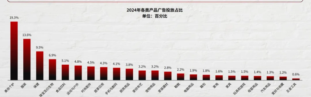 产品选择是黑五网一的核心。广告投放上,美妆个护、服装、保健品占主流,珠宝、运动户外和3C数码紧随其后。2024年全球平均折扣26%,化妆品高达40%、服装34%、护肤33%,远超平均水平。这些品类通过大促清理库存、吸引新客,实现销量翻倍。