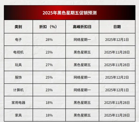 2025年预测:电子产品消费575亿美元,家居增长6.5%,食品杂货和化妆品分别涨9.3%和9.1%。折扣高峰:电子28%(网一12月1日)、玩具27%(黑五11月28日)、服饰25%(网一12月2日)。卖家建议:聚焦高频需求品,结合折扣和买赠,提前备货。