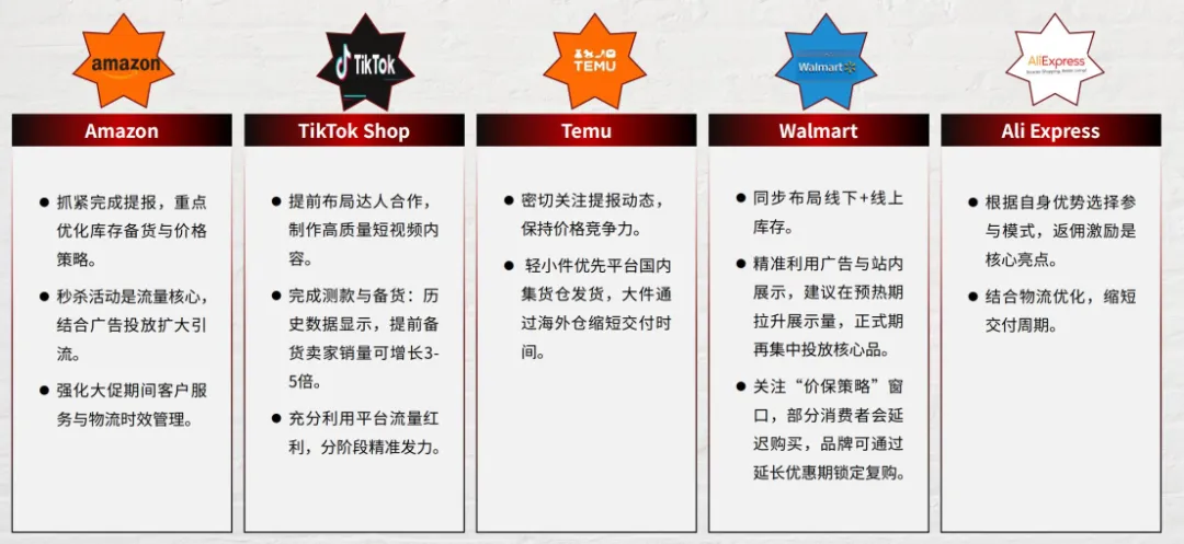新兴平台:TikTok Shop黑五开门红11月13-15日,四大品类日11月16-27日,支持Flash Sale、直播、广告返60%。Temu预热10月9日-11月1日,动态提报8折爆品。AliExpress大促11月8日-12月3日,返佣7%,优选仓物流优先。建议:TikTok达人合作、Temu控价、Ali物流优化。
