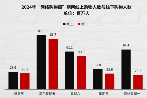 2024网络购物周,1.97亿美国人参与,黑五在线8730万人、线下8170万人;网一在线6440万人。2025年,88%计划参与,仅12%视其为“骗局”。线上占比71%,线下29%。