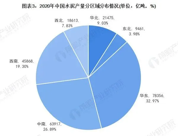 2020年,我国华东地区水泥产量为7.84亿吨,占全国水泥产量的比重为32.97%;而中南地区和西南地区的水泥产量分别为6.39亿吨、4.59亿吨,占比分别为26.89%和19.3%。