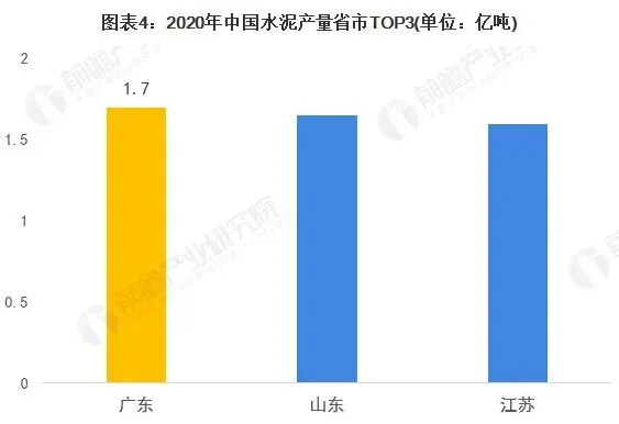 分省市情况来看,2020年广东省以1.7亿吨的水泥总产量位居第一,且广东省已连续三年位居产量首位;值得注意的是,2020年山东省水泥产量超过江苏位居第二位。