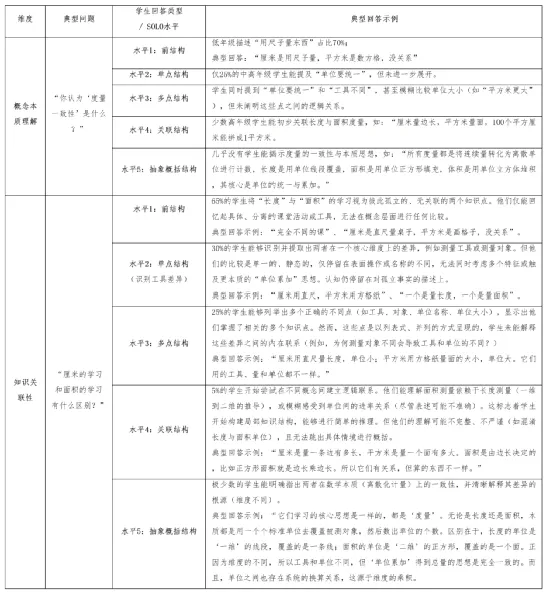 同时,对本校3-6年级学生进行访谈,结合SOLO分类理论开展深度访谈研究,访谈围绕 “度量一致性”核心概念的认知理解、思维过程与应用表现设计核心问题,通过开放性提问引导学生表达对度量本质、单位统一、量的累加及跨维度度量关联等关键内容的认知。后续依据 SOLO 理论五个认知层级,对学生的访谈回应进行编码分析,系统划分学生在“度量一致性”主题下的认知发展水平,揭示不同学段学生的思维进阶规律与认知障碍,为精准优化“度量一致性”教学策略、适配学生素养发展需求提供实证依据。