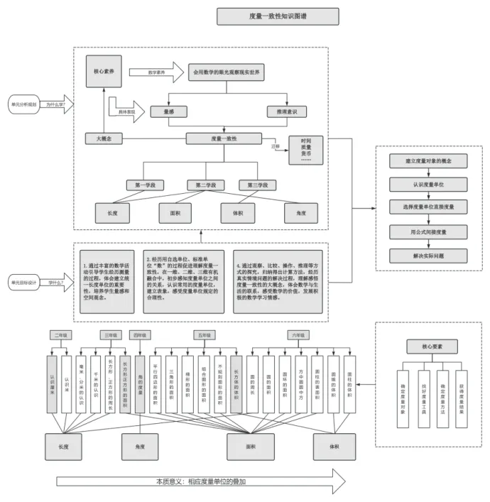 课题组结合新课标理念,对人教版新教材进行了系统梳理与深度解构。课题组以“度量一致性”为主线,对人教版教材中相关知识点进行了跨册、跨单元的结构化整合。在此基础上,构建了从1.0版本到2.0版本持续进阶的“知识图谱”。以长度、面积、体积、角度等核心度量内容为节点,以“度量思维一致性”为连接逻辑,清晰呈现各知识板块之间的纵向衔接与横向关联,形成系统化、可视化的“度量知识地图”。这一工具帮助教师从整体上把握度量教学的结构与脉络,精准识别单元教学的核心定位与进阶路径,进而设计出符合学生认知发展、强化知识关联与思维连贯的教学实施策略。通过图谱引领下的单元整体教学,不仅提升了教师备课的系统性与针对性,也有效促进了学生量感形成、推理意识发展等数学核心素养的真正落地。