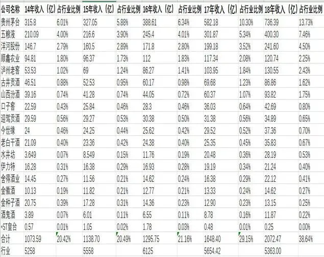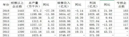 18年完成销售收入 5363.83 亿元,同比降低5.14%;累计实现利润总额 1250.5 亿元,同比增长 21.59%。2018 年,纳入到国家统计局范畴的规模以上白酒企业 1445 家,其中亏损企业183 家,企业亏损面为 12.66%;亏损企业累计亏损额 11.03 亿元。2018年,白酒行业向优质产能集中、优势品牌集中的态势越来越明朗化,加速了行业新一轮淘汰机制的到来。