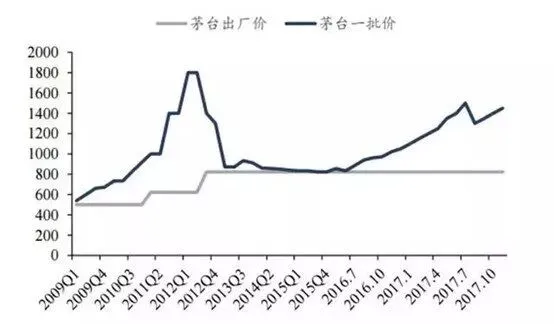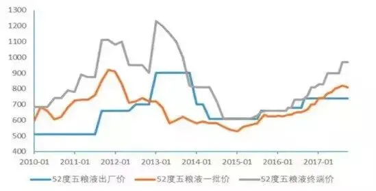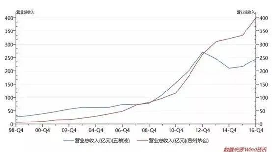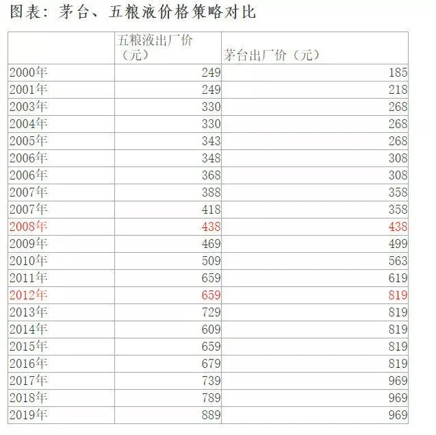 五粮液从“酒王”地位滑落,茅台后来者居上。受其影响,五粮液核心产品普五开始了长期紧跟茅台拳头产品“飞天茅台”的价格策略。