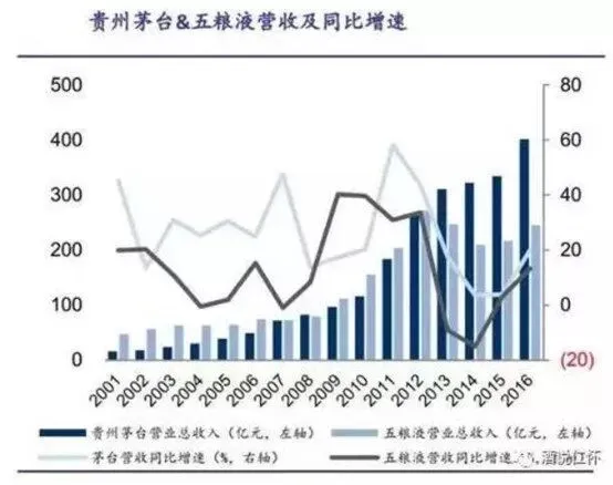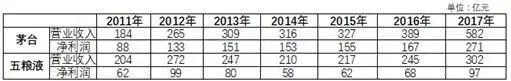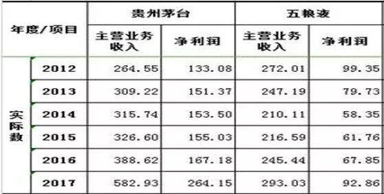 随着白酒行业调整期结束,茅台、五粮液的业绩已经双双实现上涨,只不过这一轮涨势中,双方的“跑位”发生了变化。2017年,茅台营收高达582.18亿元,五粮液则以301.87亿元居后。