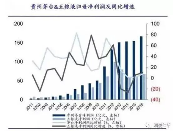 2001年茅台归母净利润 3.28 亿,五粮液归母净利润8.11亿,五粮液净利润规模大约是茅台的2.5倍,2005年茅台实现了净利润对五粮液的反超。2018年茅台归母净利润 352 亿,五粮液归母净利润133.8亿2001年至今,茅台净利润增长107倍,净利润复合增长率31.64%,五粮液净利润增长16.5倍。净利润复合增长率17.93%