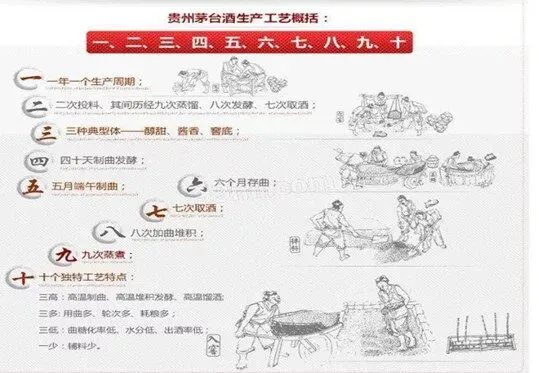 十大工艺特点:三高(高温制曲、高温堆积发酵、高温接酒)、三低(入池水份低、曲子糖化率低,原料出酒率低)、三多(轮次多、用曲多、粮耗多)、一少(辅料少)。)