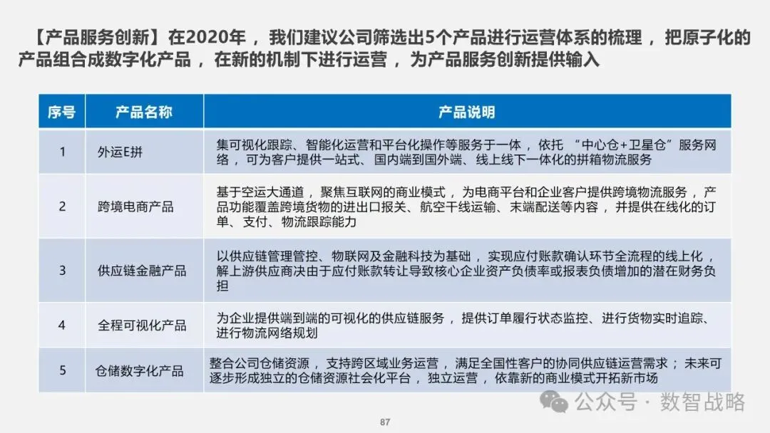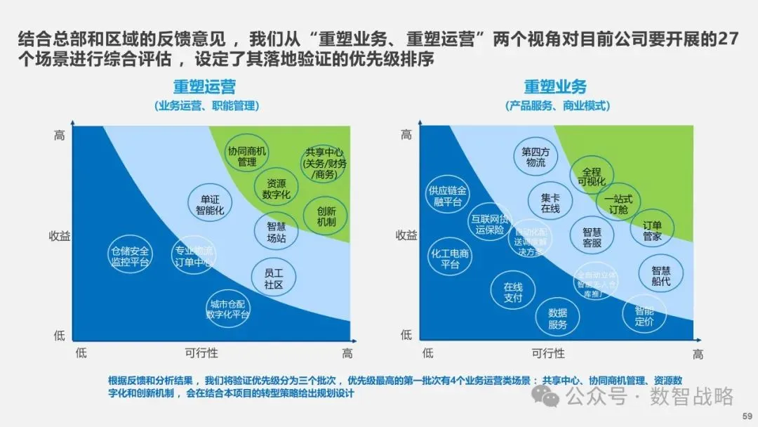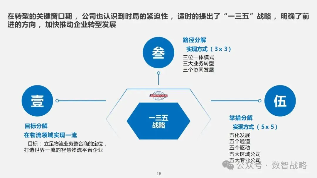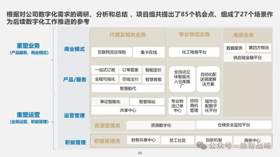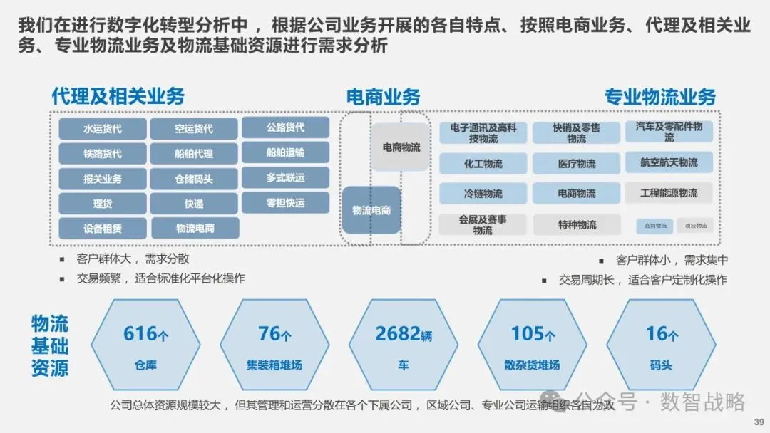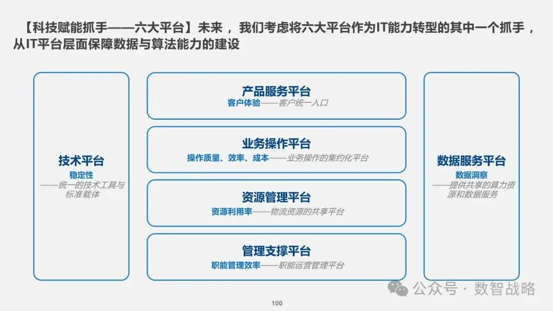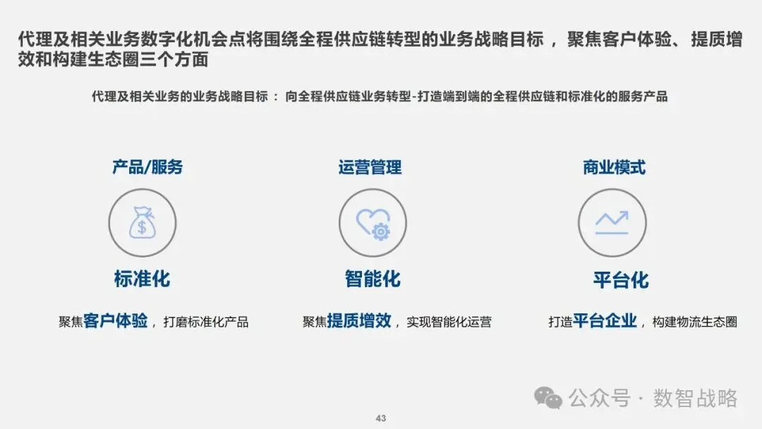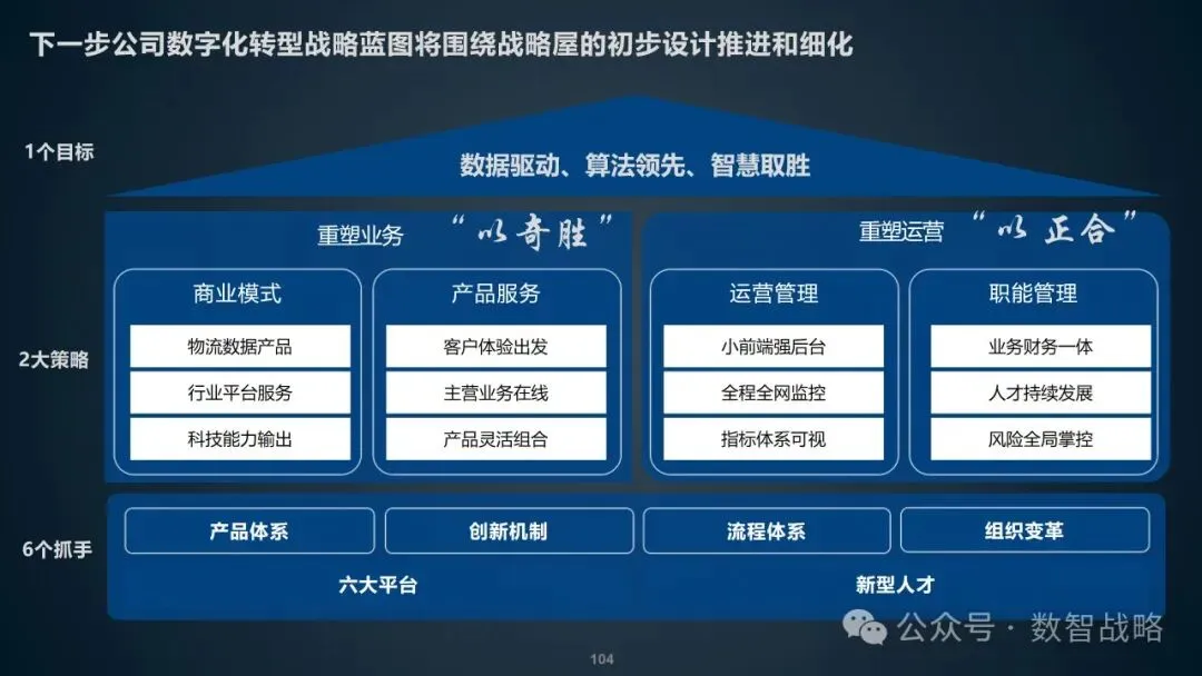 数字化战略: 企业数字化战略承接集团的数字化发展目标,结合企业自身的1-3-5战略要求,制定清晰的数字化愿景和目标。 明确企业在未来3年内数字化的整体目标,定义实现这些目标的能力框架,并设计实现目标的渐进路径。 数字化需求分析: 理解企业的业务战略和核心业务运作模式,梳理和分析数字化需求。 设计重点数字化场景运营方案,包括组织设计、业务流程和数字化技术等内容。 设计公司的数字化技术蓝图,涵盖应用系统架构、数据架构和治理架构。 数字化转型策略: 采用“以正合,以奇胜”的转型策略,通过流程优化、组织变革和科技赋能等手段,强化企业的运营管理能力。 同时,注重产品服务创新和商业模式创新,利用数字化技术开拓新市场空间和盈利模式。 数字化科技赋能: 构建六大平台,包括技术平台、数据服务平台等,作为IT能力转型的抓手,保障数据与算法能力的建设。 发展新技术应用,如ABCDT(人工智能、区块链、云计算、大数据、物联网),并将其深度融入物流行业,推动自动化与智能化。 数字化转型路径: 制定了详细的实施路径和投资匡算,确保数字化转型的每一步都具有明确的目标和里程碑。 通过项目管理确保转型过程中的风险得到有效控制,资源得到合理分配,确保项目按计划推进。