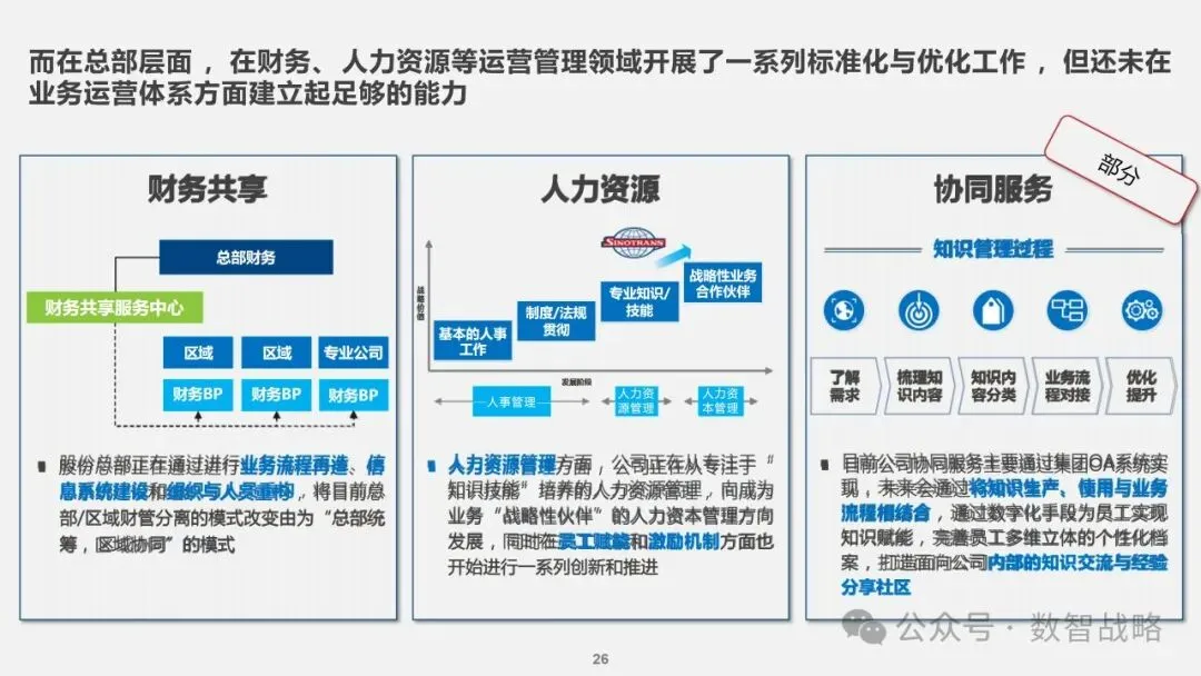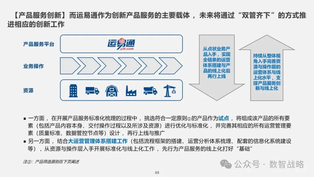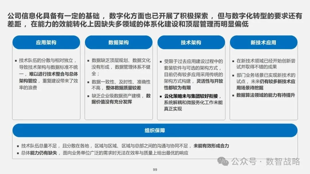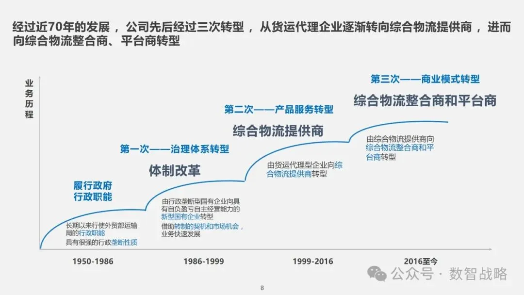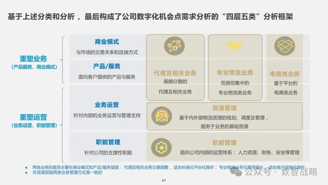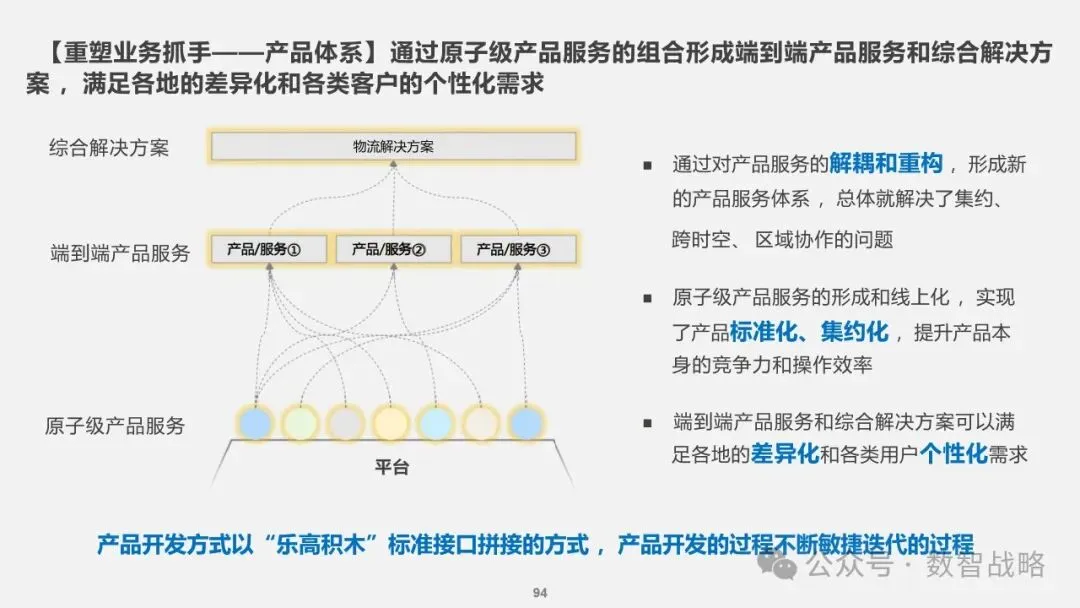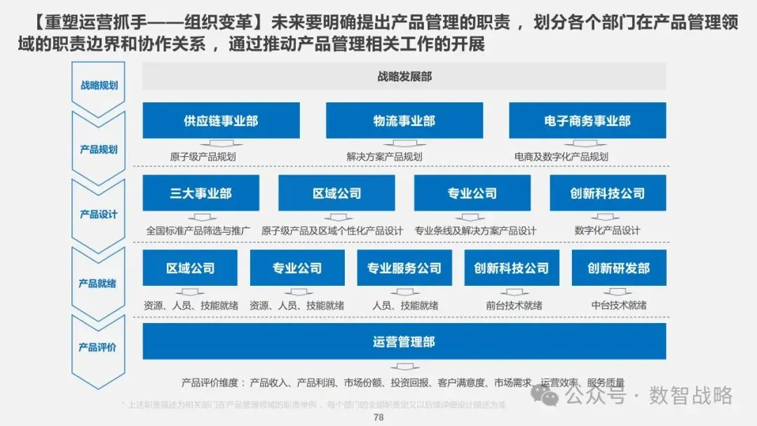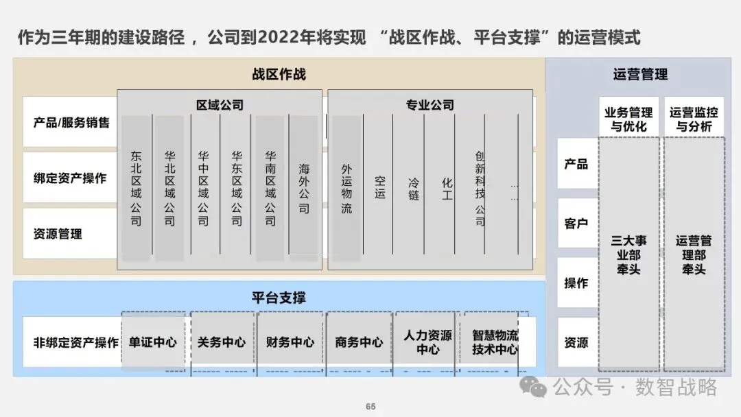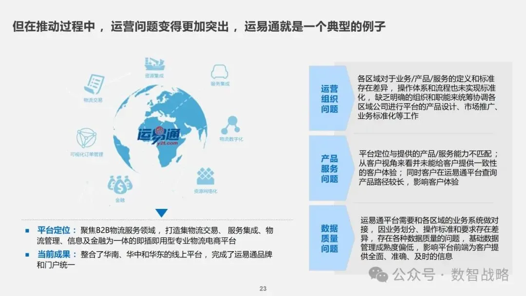 数字化战略: 企业数字化战略承接集团的数字化发展目标,结合企业自身的1-3-5战略要求,制定清晰的数字化愿景和目标。 明确企业在未来3年内数字化的整体目标,定义实现这些目标的能力框架,并设计实现目标的渐进路径。 数字化需求分析: 理解企业的业务战略和核心业务运作模式,梳理和分析数字化需求。 设计重点数字化场景运营方案,包括组织设计、业务流程和数字化技术等内容。 设计公司的数字化技术蓝图,涵盖应用系统架构、数据架构和治理架构。 数字化转型策略: 采用“以正合,以奇胜”的转型策略,通过流程优化、组织变革和科技赋能等手段,强化企业的运营管理能力。 同时,注重产品服务创新和商业模式创新,利用数字化技术开拓新市场空间和盈利模式。 数字化科技赋能: 构建六大平台,包括技术平台、数据服务平台等,作为IT能力转型的抓手,保障数据与算法能力的建设。 发展新技术应用,如ABCDT(人工智能、区块链、云计算、大数据、物联网),并将其深度融入物流行业,推动自动化与智能化。 数字化转型路径: 制定了详细的实施路径和投资匡算,确保数字化转型的每一步都具有明确的目标和里程碑。 通过项目管理确保转型过程中的风险得到有效控制,资源得到合理分配,确保项目按计划推进。