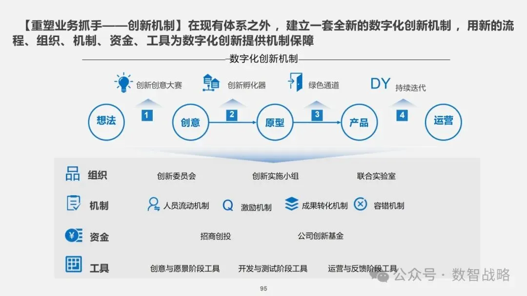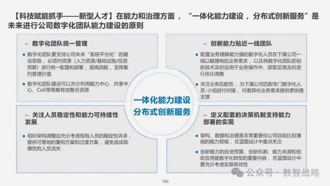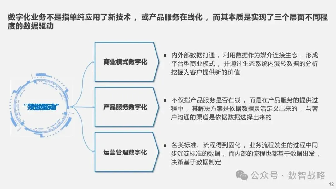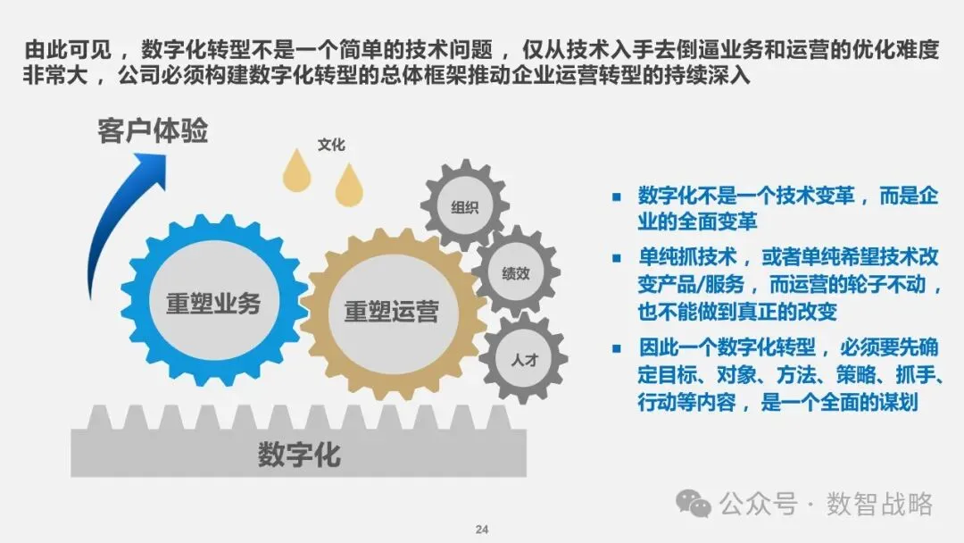 客户体验:确保数字化转型能够提升客户体验,满足个性化需求。 数据驱动:利用数据分析来指导业务决策,提高运营效率。 技术集成:整合新兴技术,打造智能化的业务流程和产品服务。 组织文化:培养一种数字化文化,鼓励创新和敏捷性。 人才发展:建设一支新型的数字化人才队伍,支持企业的长期发展。