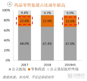 另据平安证券《药品零售行业全景图》报告显示,从2017年至2019年上半年,我国药品在零售药店渠道的销售占比从22.6%逐步上升至2019年上半年的23.1%,且根据调研结果显示,国内大型连锁药店处方药的销售占比每年约上升2个百分点。