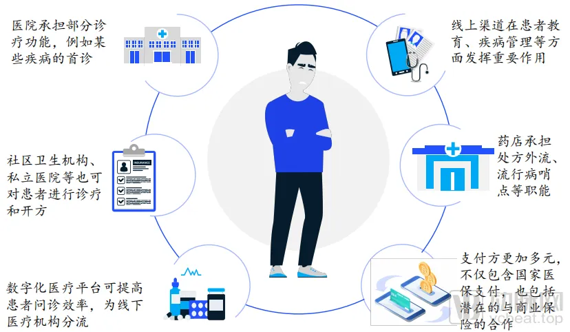 1. 医疗去中心化;除以医院为中心的传统医药供给体系外,多元化的医疗服务提供形式和载体快速兴起以满足个性化需求;高度互联网化的医疗消费者开始出现;