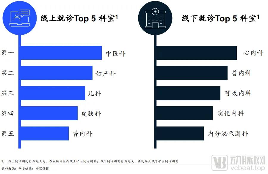 而从科室分布来看,线上、线上渠道的需求场景既有差异又互为互补。线上就诊科室聚焦在中医科、妇产科、儿科等综合性科室,而线下就诊科室聚焦在心内科、普内科和呼吸内科等特定疾病科室。
