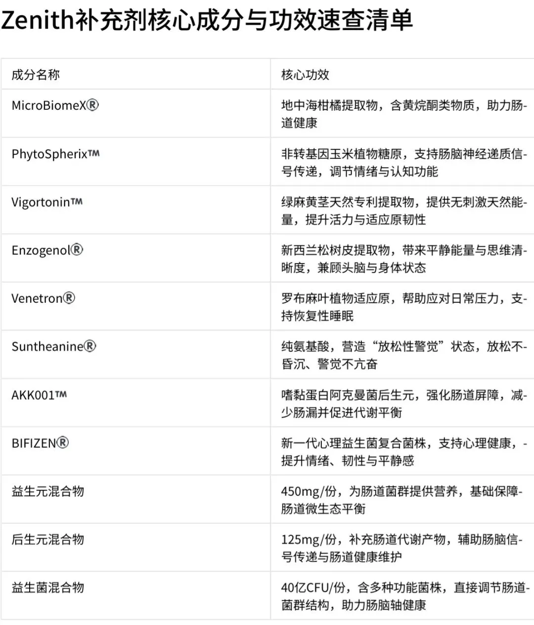 Zenith的每一种成分均经专利研究验证,依据与人体的实际作用机制筛选,无任何“猜测性添加”:1.MicroBiomeX®:从地中海柑橘类水果中提取的革命性益生元成分,含高浓度黄烷酮类物质(橙皮苷、柚皮苷),助力肠道健康。2.PhytoSpherix™:源自非转基因玉米的植物糖原,支持肠脑神经递质信号传递,调节情绪、认知功能与整体健康。3.Vigortonin™:从绿麻黄茎中提取的天然专利成分,提供无刺激性的天然能量与适应原韧性,提升活力与耐力。4.Enzogenol®:新西兰松树皮专属提取物,兼顾头脑清晰与身体状态,带来平静能量与思维清晰度。5.Venetron®:从罗布麻叶中提取的植物适应原,帮助应对日常压力,支持恢复性睡眠。6.Suntheanine®:纯氨基酸成分,营造“放松性警觉”状态,实现放松不昏沉、警觉不亢奋的效果。7.AKK001™:稳定的“关键”后生元(嗜黏蛋白阿克曼菌),强化肠道屏障完整性,减少肠漏并促进代谢平衡。8.BIFIZEN®:新一代“心理益生菌”复合菌株(LF16、LR06、LP01、BL04),支持心理健康,提升情绪、韧性与平静感。此外,产品每瓶含60粒素食胶囊,辅料仅为植物纤维素、苹果纤维与植物油粉,成分纯净且适配素食人群。四、产品优势:区别于主流补充剂的核心价值1.靶点精准:直击肠脑连接的核心沟通系统,而非仅改善单一症状,实现从根源调节身体状态。2.无副作用:全程不含咖啡因,避免了兴奋剂引发的紧张、心悸或能量骤降问题。3.多效合一:同时覆盖肠道健康、神经递质优化、抗压能力、精力与专注力提升等多个维度,无需叠加多款补充剂。4.成分权威:所有原料均有专利研究背书,并非普通原料的简单堆砌。