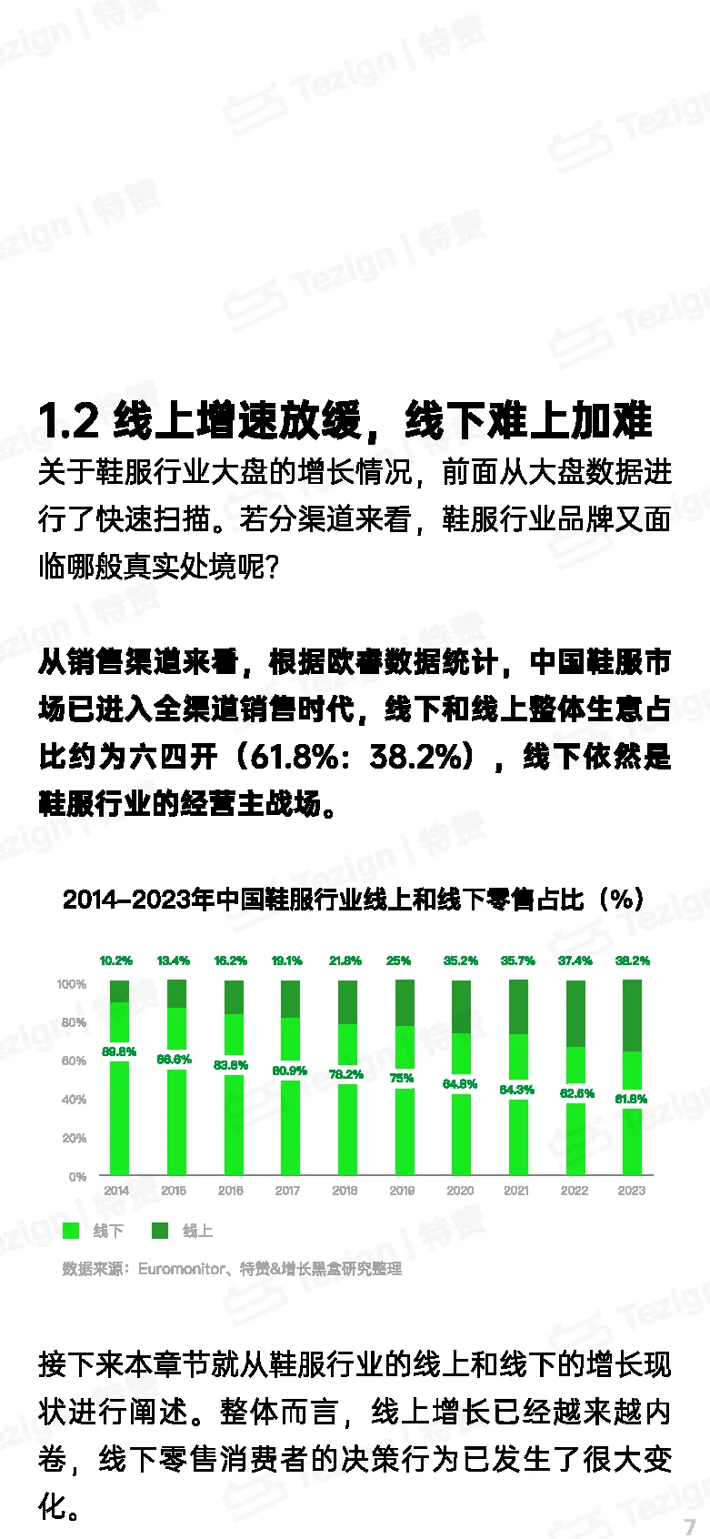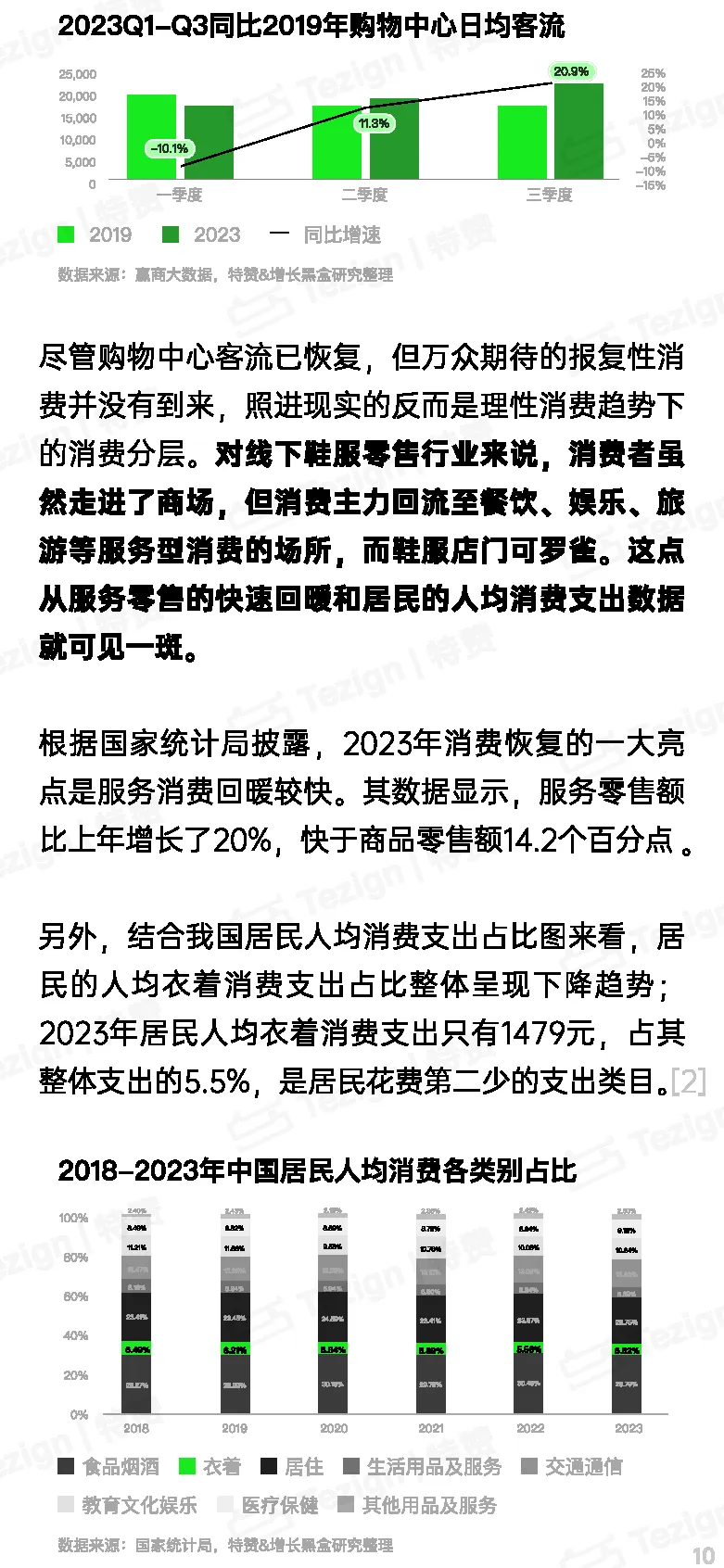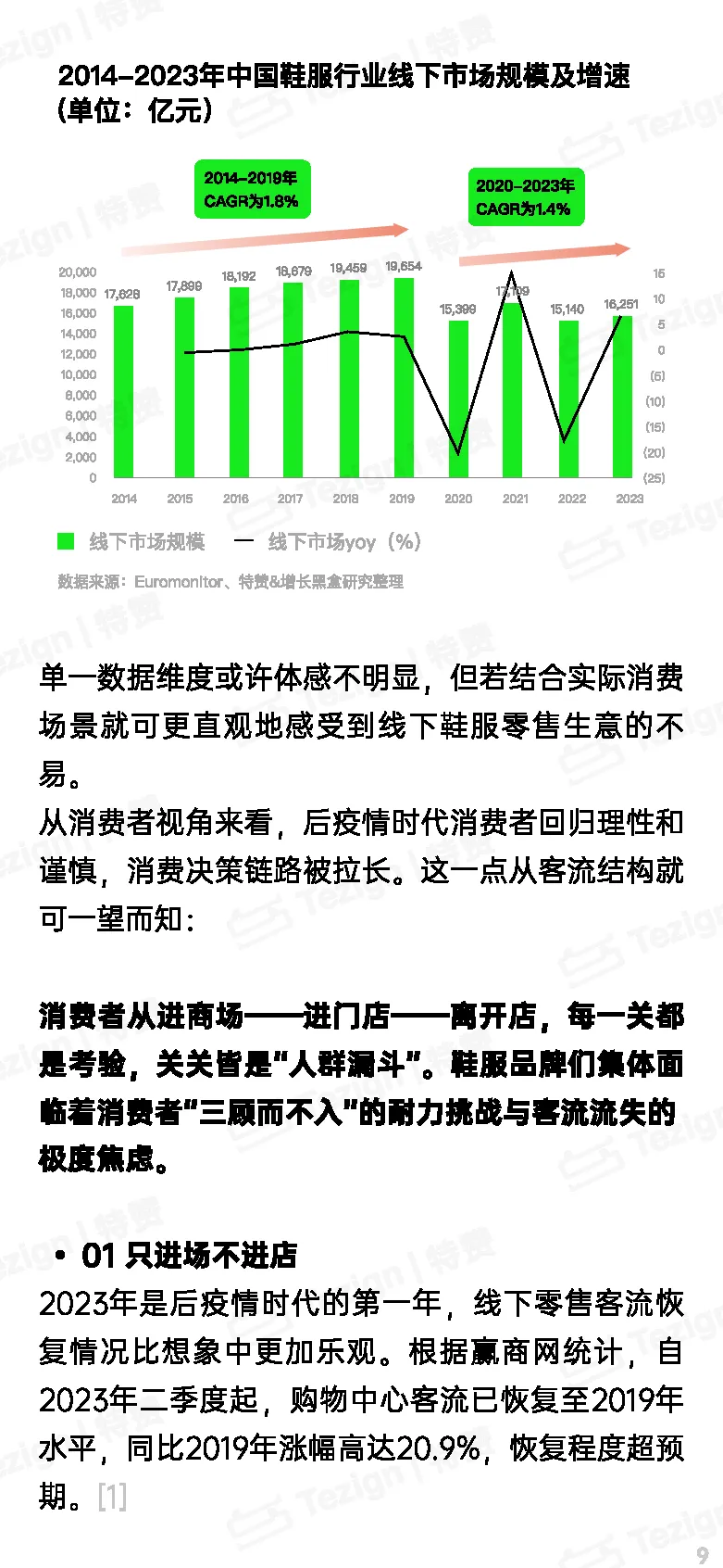 线上渠道虽不断扩大市场份额,但流量红利的消失使其增速放缓,尤其在近几年,线上增量变得愈发艰难,商家开始陷入内卷状态。线下零售市场更为严峻,尽管2023年购物中心客流逐步恢复至之前的水平,但鞋服实体店却并未迎来期盼已久的报复性消费热潮,反而面临消费者只进场不进店的尴尬境地,品牌不得不直面三顾而不入的客流困境。