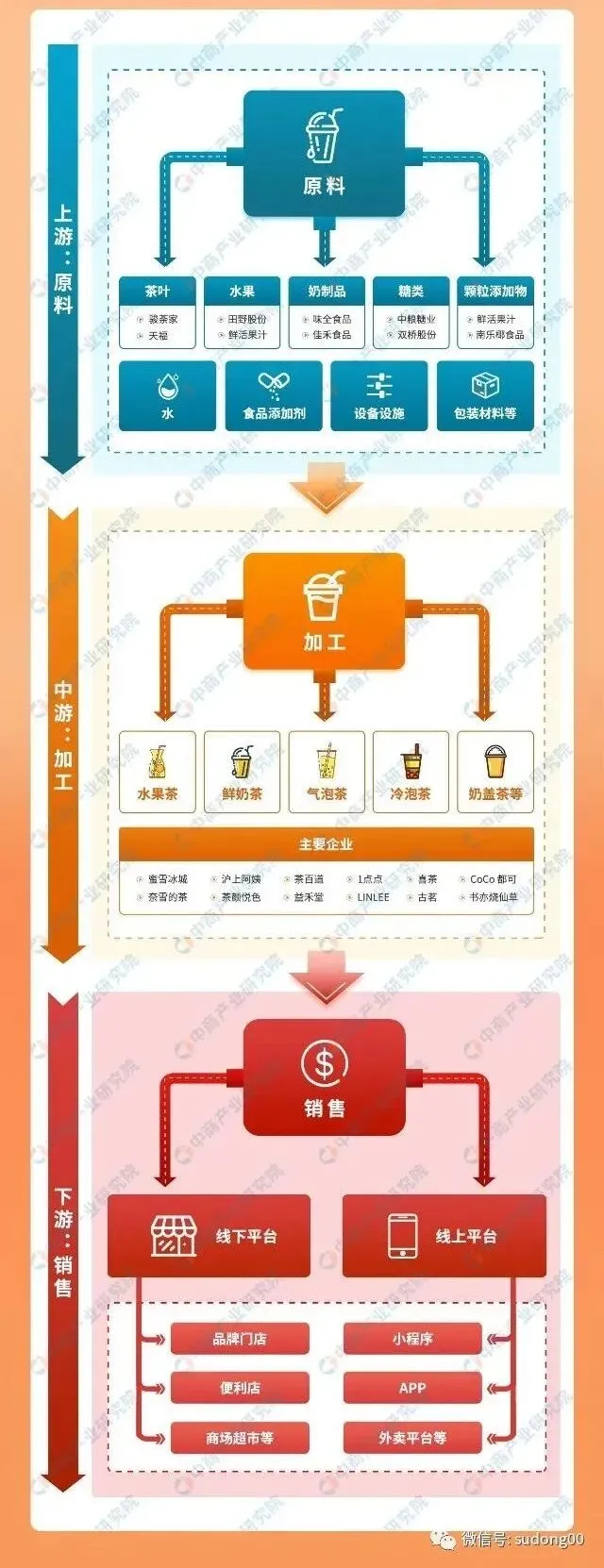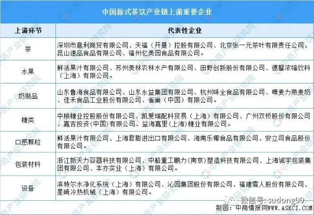 上游:茶叶、水果、蔬菜,奶制品、糖类、颗粒添加物等原材料,