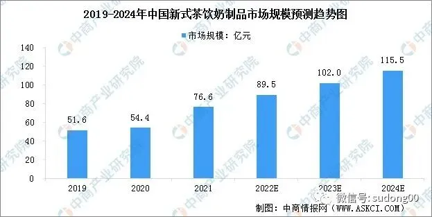2019-2021年年均复合增长率达到21.84%,预计2024年中国新式茶饮奶制品市场规模将达到115.5亿元。