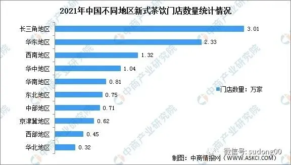 长三角地区、华东地区、西南地区、华中地区、华南地区的新式茶饮门店数量分别达到3.01万家、2.33万家、1.32万家、1.04万家、0.81万家。