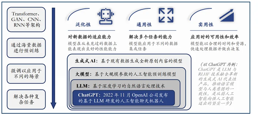 大模型是基于预训练技术框架,从属于AIGC的底层模型,是指具有数十亿甚至上百亿参数的深度神经网络模型,属于生成式AI范畴。其原理是基于海量无标注数据进行预训练,提升模型的知识水平,后续再利用下游特定任务上的小规模有标注数据对大模型进行领域知识微调或使用提示词工程,即可高水平地完成多个应用场景的任务。
