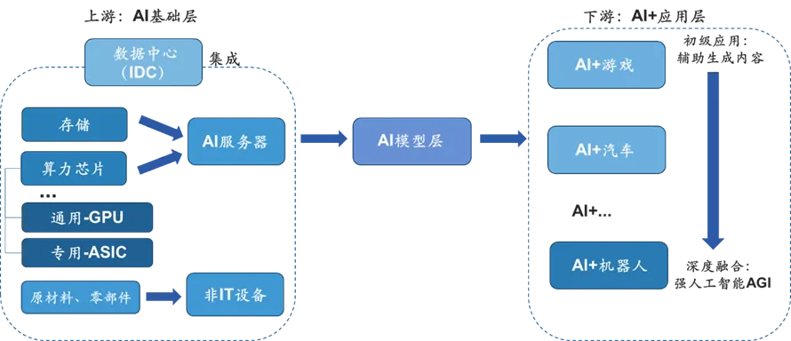 基础层:数据中心收入端来源于算力租赁及算力优化服务;上游设备及零部件如芯片、服务器等,商业模式按当前行业/标品模式销售。