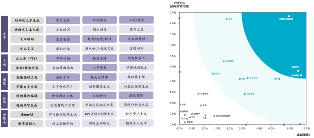 AIGC的高度的信息收集与总结能力与知识服务型人才的核心素质重叠较高,人效优化潜力最大,因此互联网与高科技领域、金融服务、专业服务等知识密集型行业有望率先实现AI应用落地。相反,农业、建筑业等体力密集型行业的生产制造成本占比高、以人工的程式化作业为主,与生成式模型的优势相关性相对较低,预计前期AI对该类行业影响不大。