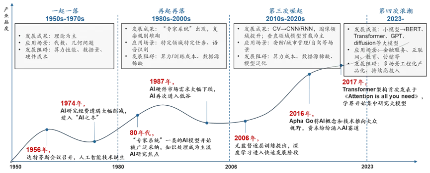 技术栈角度,上一波AI发展潮源自2015年人工智能芯片硬件成熟度提升,带动CNN、RNN等深度学习模型加速在门槛较高的2B垂直领域应用;而2017年起以Transformer为代表的大模型架构受到重视,直到2023年初催生C端爆款应用ChatGPT并正式推动AI第四次发展浪潮。
