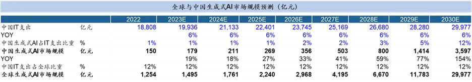 结合IT支出与生成式AI渗透率对生成式AI市场规模进行测算得出的数据进行分析。目前,尽管2022年各行业IT市场占总市场比例仍然较低,但随着数字化经济的不断发展,IT占比将持续上升。
