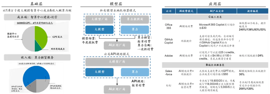 模型层:1)私有化部署模式。大模型厂商向AI应用商收取年度授权费、或公有API调用模式。大模型厂商按客户内容生成量收费,收费金额与大模型训练成本直接挂钩。